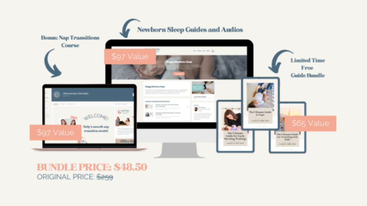 This is the ultimate Newborn Course bundle that helps families navigate through the newborn fog, so you can transition gradually to longer naps, crib/bassinet sleep, decrease feed to sleep associations over time, and set yourself up for GREAT NIGHTS AND NAPS!